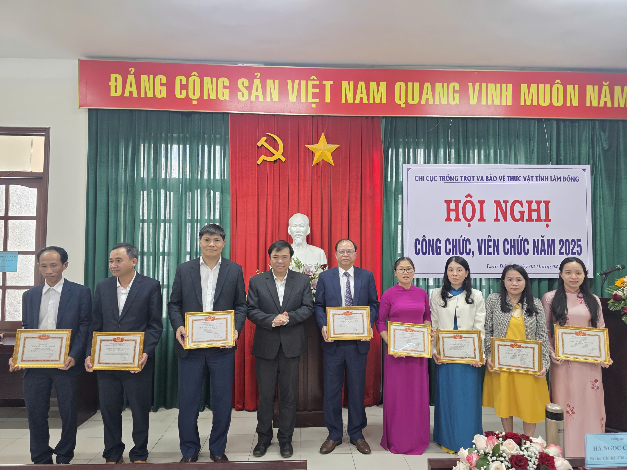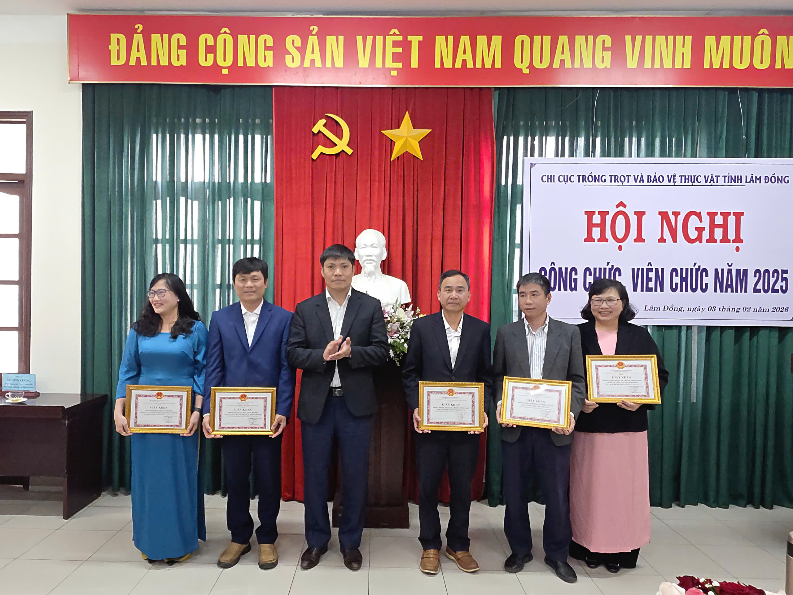 Với những kết quả đã đạt được trong năm 2025, tập thể Chi cục Trồng trọt và Bảo vệ thực vật tỉnh Lâm Đồng đã được Giám đốc Sở Nông nghiệp và Môi trường tặng giấy khen hoàn thành xuất nhiệm vụ; 05 tập thể phòng, trạm được Giám đốc Sở tặng Giấy khen; 15 cá nhân được Giám đốc Sổ tặng giấy khen; 12 cá nhân được xếp loại hoàn thành xuất sắc nhiệm vụ; 08 cá nhân được tặng danh hiệu chiến sĩ thi đua cơ sở và 61 cá nhân đạt danh hiệu Lao động tiên tiến.
